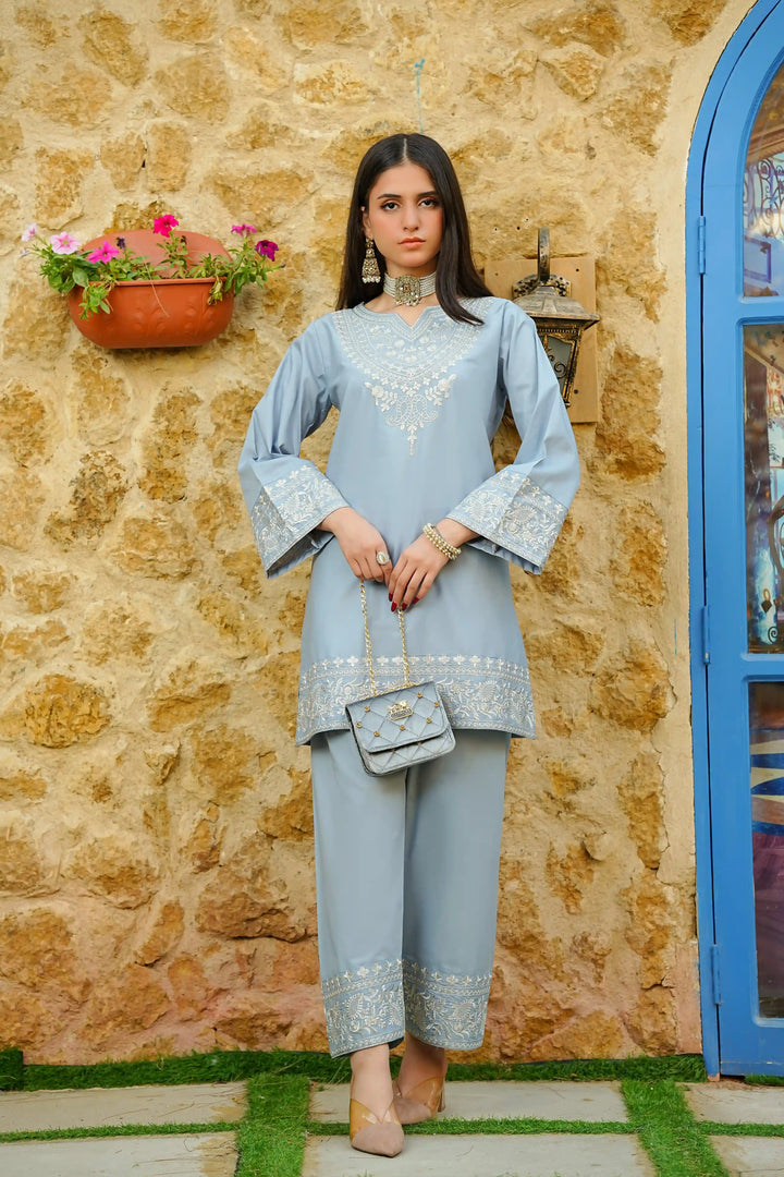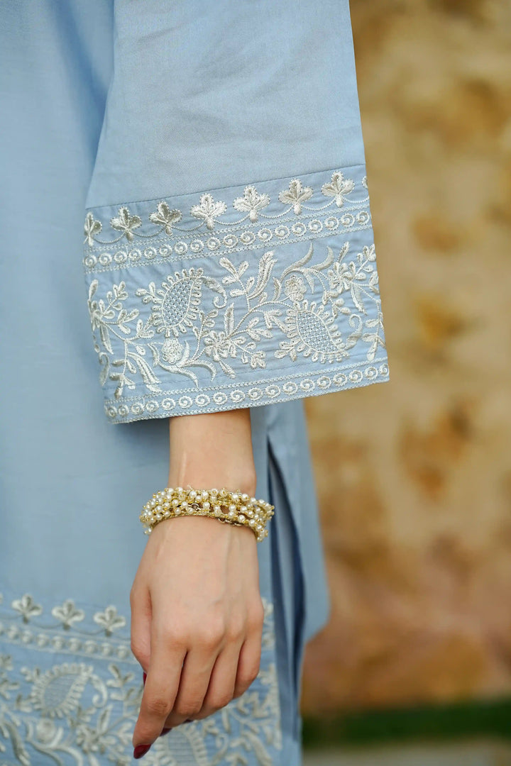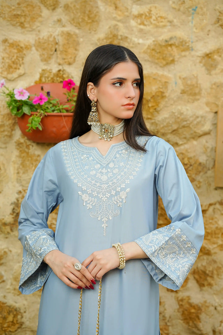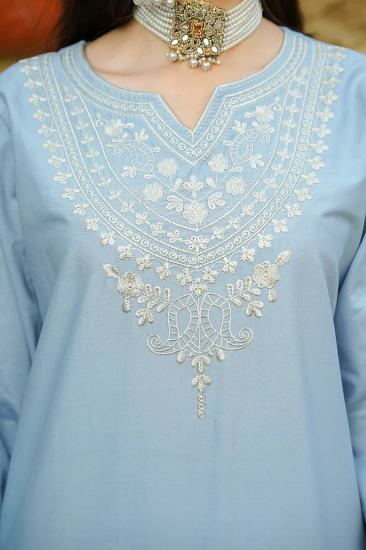 A vision of grace, Neesha is a 2-piece stitched ensemble crafted from premium cotton, offering both comfort and sophistication. The soft blue hue is adorned with delicate embroidery, exuding timeless charm. Elegant detailing on the neckline, sleeves, and hem adds an exquisite touch, making it perfect for both casual gatherings and festive moments. With its effortlessly chic silhouette, Neesha is designed for the modern woman who embraces understated luxury. ๐ธ๐ซ
